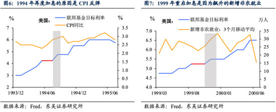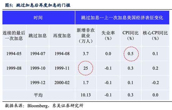 纵向来看,美联储在1994年和1999年都是“跳”过一次会议再加息。1994年5月美联储原本希望自20世纪80年代以来的首次50bp的激进加息足够紧缩,但无奈通胀意外飙升,因此仅是在“跳”过了6月会议后便重启激进加息。1999年8月加息25p后虽然通胀温和,但非农就业持续大增且失业率走低,因此美联储仅是“跳”过了9月的会议,便又从11月开始持续加息。