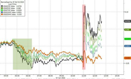 美债遭遇的冲击则更明显:各期限美债收益率在北京时间凌晨2点过后曾一度全线向上狂飙,纷纷录得两位数基点的盘中涨幅,直到鲍威尔新闻发布会举行后,行情走势才再度逆转……