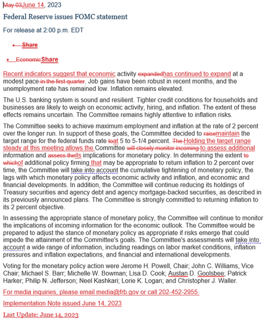 在对本次会议缘何作出暂停加息决定的问题上,鲍威尔还解释道,对“暂停”的理解,不应当认为6月暂停加息是“跳过”。共识是,随着我们接近利率目标,略微放慢紧缩节奏。我们已经非常更加接近具有限制性的利率水平。