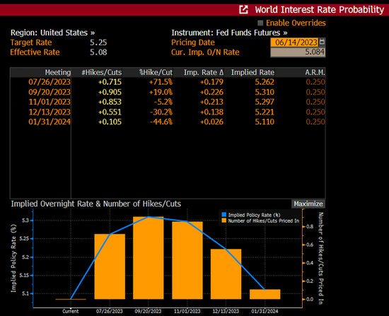 与美联储会期挂钩的利率互换合约目前预计,政策利率将于9月在5.32%水平见顶,2023年12月合约利率则跃升至了约5.23%。