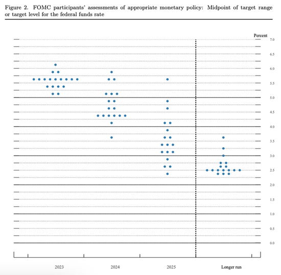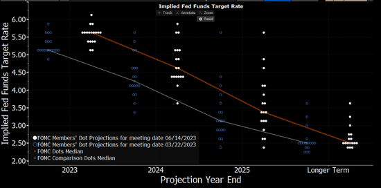虽然美联储在此前“十连加”后,在周三如市场预期暂停了加息,但这是一次很明显的“鹰式停顿”。甚至于,美联储利率点阵图直接亮明了未来还可能进行2次25个基点的加息,这要比原先市场上那些鹰派的预估还要鹰派,直接导致了美国股债市场在2点过后的双双跳水。