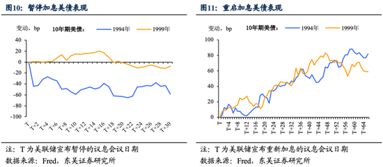 那么主要资产会如何定价美联储的以“跳”为进?我们可以分成两个阶段来分析:一是暂停加息的时间窗口,通常是一个月,二是重新开始加息之后。从前两次历史来看,在股债汇三类资产中,暂停加息最利好美股,而重启加息后美债收益率可能再次上涨: