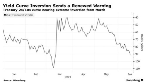 在美联储6月会议上宣布15个月以来首次暂停加息,但随后指出其准备在今年再加息50个基点后,周三,对政策敏感的短期国债遭到抛售,而长期国债则出现反弹。这使得收益率曲线倒挂(以两年期和10年期国债收益率之差衡量)超过90个基点,接近本轮紧缩周期109个基点的极端水平(上一次出现这一水平还是在3月份)。