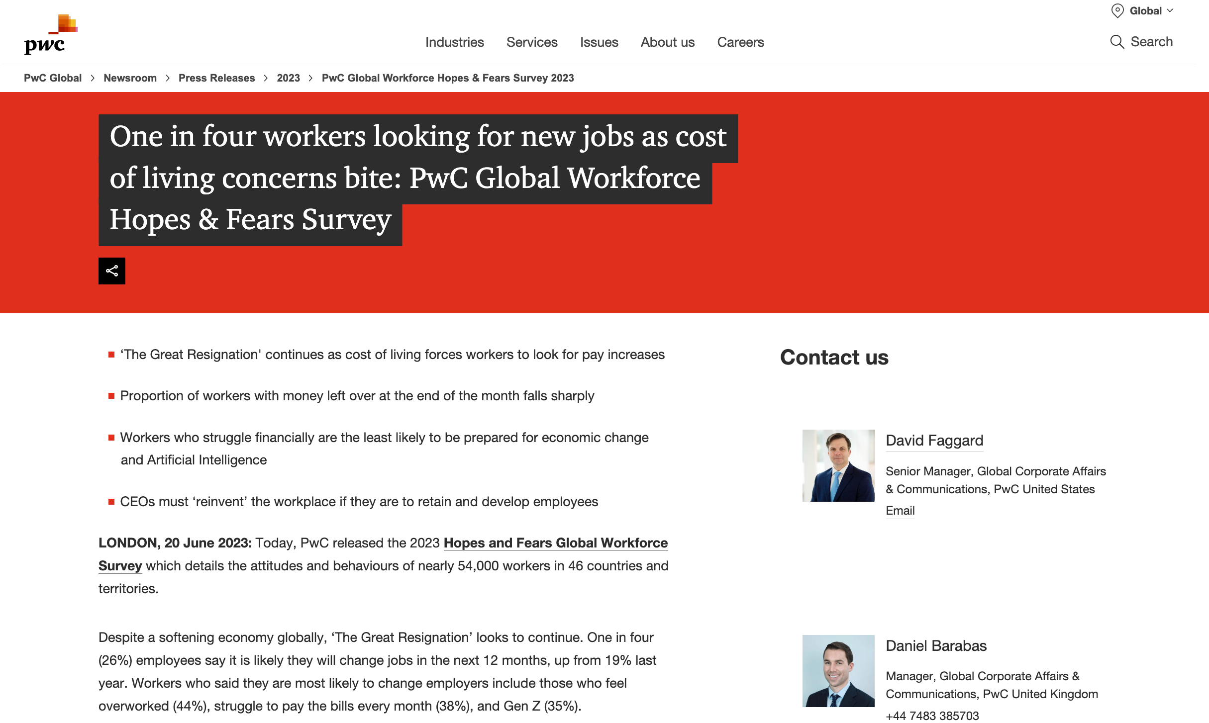 “随着经济不确定性持续,我们看到全球劳动力希望获得更高的薪酬,并从工作中获得更多意义。”普华永道人力与组织业务全球联席主管Bhushan Sethi表示。