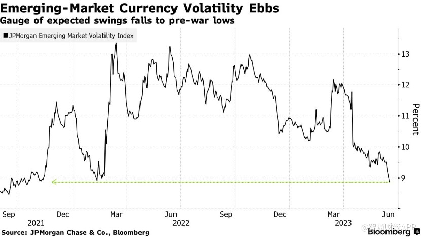 期权交易商已将他们对新兴市场货币波动的预期下调至2022年2月俄乌冲突爆发之前的水平。摩根大通新兴市场波动指数上周五跌至8.86%,该指数是预测未来三个月外汇波动的指标。这是自俄乌冲突爆发以来该指数首次收于9%以下,也是自2021年10月以来的最低水平。