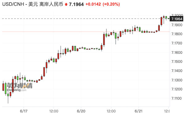 6月21日上午,离岸人民币对美元一度跌破7.2关口。