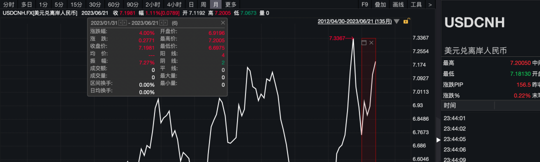 今天(6月21日)一早,离岸人民币对美元汇率盘中一度跌破7.20关口,为去年11月末以来首次。