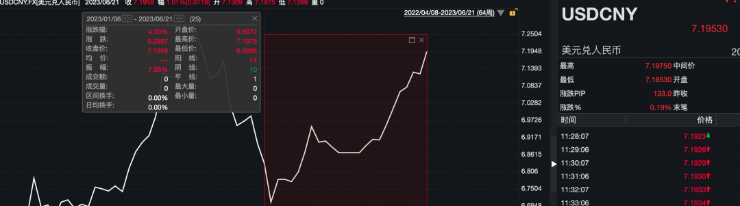 5月17日、5月18日,离岸人民币、在岸人民币相继突破7.0整数关口,“跌跌不休”近一个月。直到美联储暂停加息、美元指数走弱,6月15日人民币对美元汇率才开始回升。不过在经历上周短暂的升值后,人民币对美元汇率本周重回跌势。