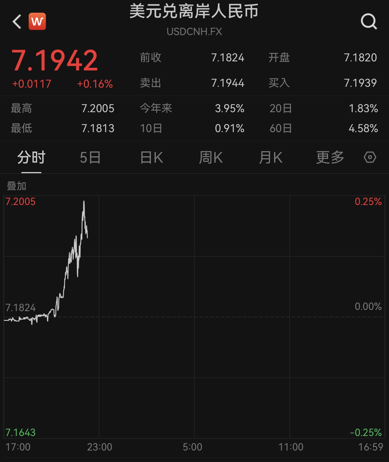【xm外汇】离岸人民币对美元一度跌破7.2关口,去年11月末以来首次