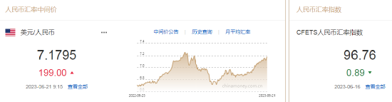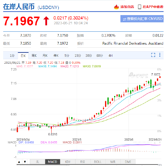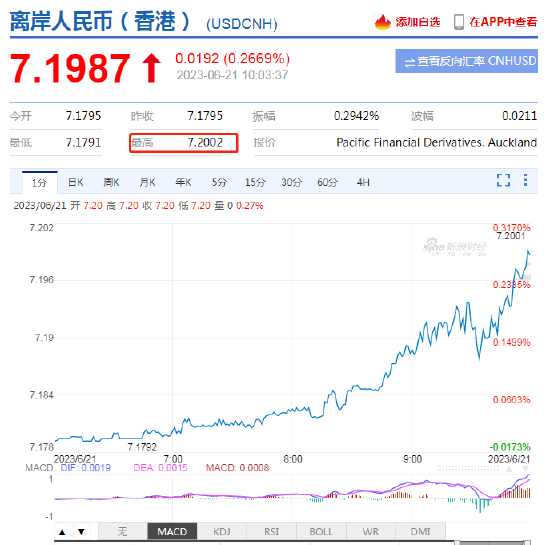 6月21日,离岸人民币走弱,跌破7.20关口,日内贬值近200点。在岸人民币跌破7.19。