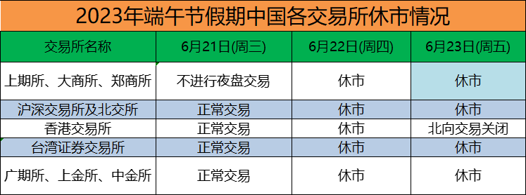 需要特别注意的是,6月21日,也就是端午节前一天,上期所、大商所和郑商所不进行夜盘交易;6月23日,中国香港交易所的北向交易关闭。