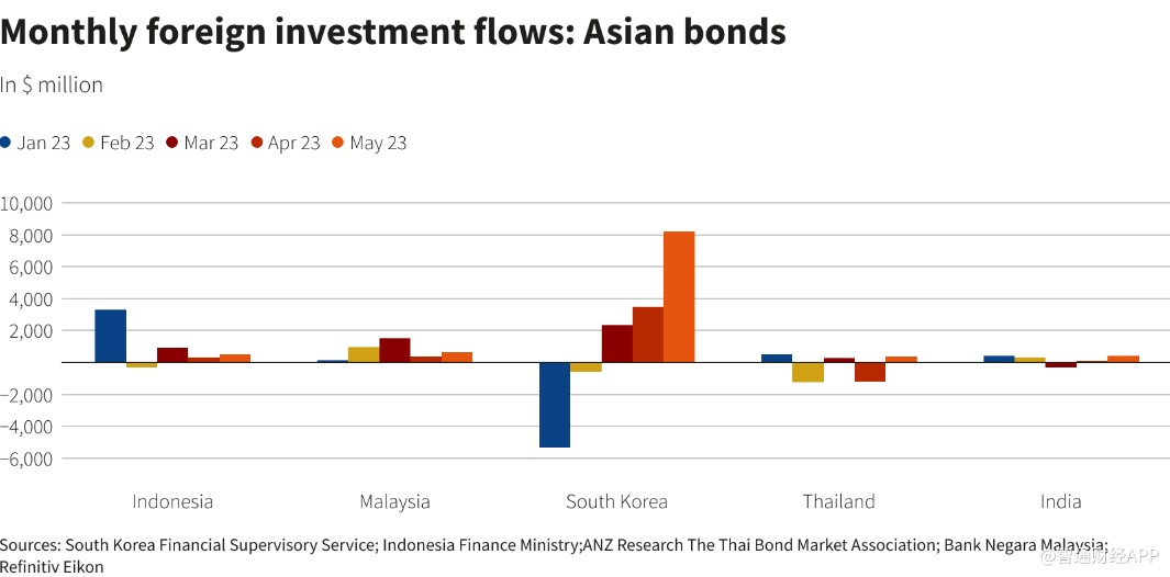 由于市场预期美联储紧缩政策将减弱,亚洲债市5月吸引的外国资金流入量达到约两年来最高。监管机构和债券市场协会的数据显示,外国投资者在印度、印尼、马来西亚、韩国和泰国净购买了价值101亿美元的债券,这是自2021年6月以来最大的月度购买量。