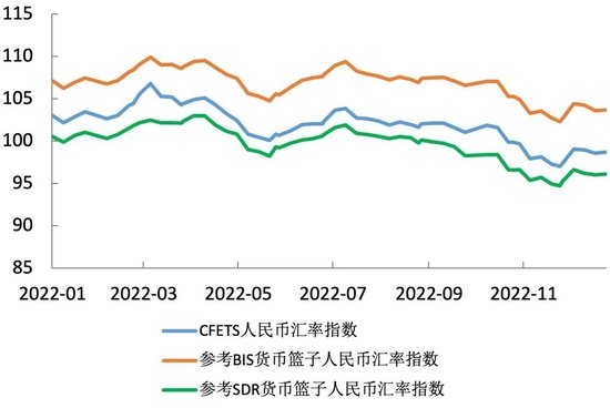 2022年,人民币汇率指数表现强劲,CFETS指数年中一度创历史新高,CFETS、BIS和SDR货币篮子指数年末分别收于98.67、103.67和96.08,较上年末分别贬值3.71%、2.80%和4.25%,贬幅均小于即期汇率贬幅。人民币对一篮子货币汇率相对稳定,有效减轻了汇率过度波动对实体经济的影响。从国际市场看,在美元走强的大背景下,人民币汇率表现优于主要储备货币。在全球二十多种主要货币中,人民币对美元汇率贬幅在全球排名居中,表现优于英镑(10.71%)、日元(12.23%),多数时间优于欧元。
