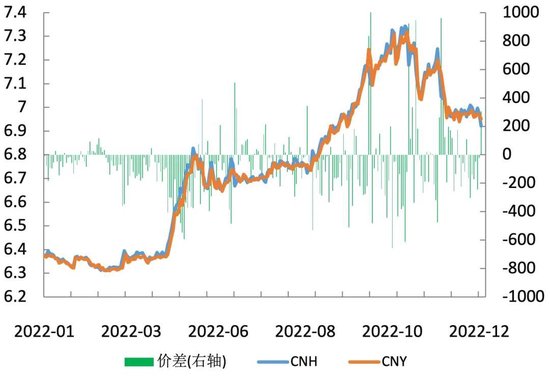 1—3月,人民币汇率总体稳定在6.35水平波动,其间受俄乌冲突影响走强至6.30,显示出一定的避险货币特征;4—10月,受美联储加息步伐加快、国内疫情不断反复等因素影响,人民币经历了两轮快速走贬,最低贬至7.33;11—12月,受美联储紧缩预期放缓、国内疫情防控优化等因素影响,人民币企稳走强至6.9附近。年末,人民币对美元即期在岸、离岸汇率分别收于6.9514、6.9210,较上年末贬值8.32%、8.04%,整体走势一致。