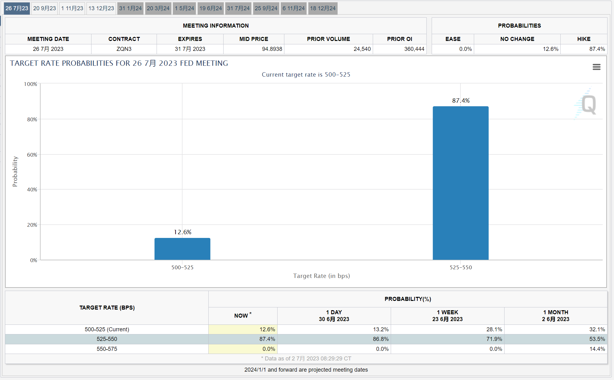 CME美联储观察工具显示,截至发稿,市场预计美联储在7月政策会议上加息25个基点的概率已高达87.4%,而按兵不动的概率仅为12.6%。
