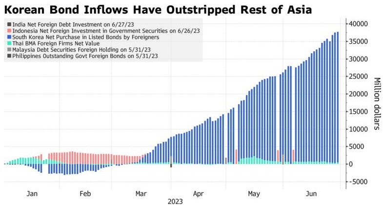 今年以来,全球投资者一直在增持韩国债券,5月和6月的购买量加速增长,总计超过230亿美元。数据显示,今年迄今为止,他们已向这些债券注入了370亿美元,是亚洲最多的国家。