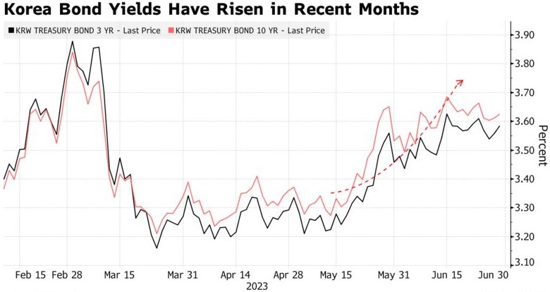 市场观察人士表示,今年以来,韩国债券一直是外国投资者在亚洲的优秀选择,近期的下跌应被视为又一个买入良机。随着韩国政府有关部门就粘性通胀对利率的潜在影响发出警告,债券收益率已连续三个月上升。然而,本周公布的数据预计将显示,6月份消费者价格预计将连续第五个月下滑,这为韩国央行在7月中旬的评估中软化立场提供了理由。