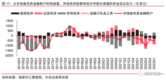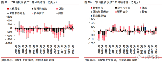 其他投资账户录得较大规模顺差,有效对冲部分渠道的资金流出压力。2020-2021年,受益于良好的疫情防控,我国经济基本面表现强劲,叠加美联储保持宽松货币政策,我国的直接投资和证券投资账户呈现较高规模的资本流入,在此背景下其他投资项呈现净流出状态。2023年一季度,我国对境外其他投资净流出规模收窄至129亿美元,同时吸收其他投资净流入规模203亿美元,导致“其他投资”项录得331亿美元的顺差,有效对冲部分渠道的资金流出压力。由此来看,其他投资项对于我国国际收支自主平衡起到重要作用。从分项来看:(1)“其他投资:资产”(代表我国对境外其他投资)方面,“货币和存款”净流入221亿美元,“贷款”分项的净流出312亿美元,季节性因素导致一季度企业出口收款较快,导致贸易信贷资产净流入增加;(2)“其他投资:负债”(代表我国吸收来自境外的其他投资)方面,吸收货币和存款415亿美元,同时偿还进口应付款导致贸易信贷负债净流出342亿美元。