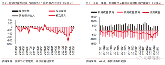 出口有韧性与进口仍疲弱格局下,“货物”项顺差保持在一定规模,成为经常项目顺差的可靠依赖。考虑后续海外经济衰退压力的逐步凸显,“货物”项顺差有压力也有韧性,但规模或较过去两年有所收缩。2023年一季度,我国出口金额与去年基本持平,进口录得-7%的同比下跌。具体来看,同期,出口在贸易伙伴和贸易商品等维度均呈现出边际修复,导致出口在短期内仍维持韧性;虽然一季度的内需持续修复,但受制于大宗商品进口价格同比回落以及地缘政治因素导致部分商品进口表现疲软,进口的整体表现仍是同比深跌状态。在此背景下,我国贸易顺差虽有回落但仍保持一定规模,对经常项目顺差提供重要支撑。往后看,预计在海外发达经济体衰退逻辑延续的情况下,外需回落仍将构成中国出口增长的一大制约。出口有韧性与进口仍疲弱的格局或导致“货物”项顺差有压力也有韧性,但规模或较过去两年有所收缩。