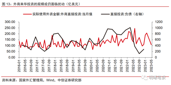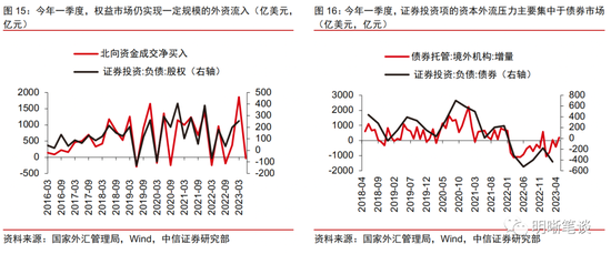 金融账户:资本外流压力尚存,但较去年有所收敛。2023年一季度,我国“非储备性质的金融账户”逆差规模继续走阔,储备资产小幅增加。其中,对外直接投资规模增长,但外商来华直接投资规模边际回落,导致直接投资项逆差走阔,预计后续将吸引外商投资的重要性不断提升;受制于中美10年期国债利差深度倒挂,证券投资账户的资本外流压力主要集中于债市,国际收支中的“证券投资:负债:股权”顺差规模实现环比增长,一定程度对冲了债券市场的外资流出压力;其他投资账户录得较大规模顺差,有效对冲部分渠道的资金流出压力。