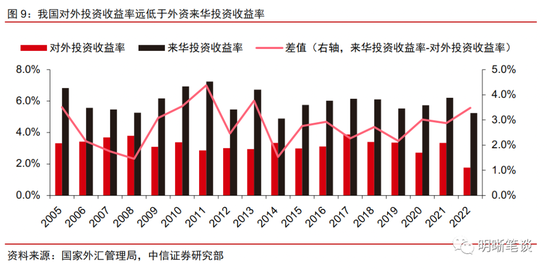 我国居民从海外获得的收入增加和外国居民从我国获得的投资收益减少共同带动初次收入逆差明显收窄。“初次收入”账户包括雇员报酬、投资收益和其他初次收入三个分项,其中投资收益在我国“初次收入”账户中占比较大,具体包括“因金融资产投资而获得的利润、股息(红利)、再投资收益和利息”。该账户逆差往往表明我国居民通过海外资产而获得的投资收益低于外国居民通过我国资产而获得的收益。今年一季度,由于美联储持续加息导致美债利率高位运行,“投资收益:贷方”(我国居民从海外获得的收入)规模为496亿美元,同比增加29.6%。“投资收益:借方”(外国居民从我国获得的收入)规模录得609亿美元,同比下跌26.3%,以上两个因素的相互作用带动初次收入逆差明显收窄。但从逐年表现来看,我国对外投资收益率远低于外资来华投资收益率,一方面,对外投资收益率水平较低在一定程度上表明居民和企业需要提升其海外资产配置能力;另一方面,来华投资的高收益也体现出我国国内市场发展的巨大潜力,这对未来继续吸引外资持续流入具有积极作用,获得的高收益或重新体现在金融账户中的“直接投资”账户和“证券投资”账户的流入。