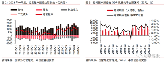 今年一季度,货物顺差收敛叠加服务逆差走阔,带动我国经常账户顺差规模边际收窄,但短期来看仍保持在较高水平。数据方面,2023年一季度,经常项目顺差录得815亿美元。观察分项表现,外需承压叠加节假日因素使得货物顺差规模进一步收敛,服务贸易逆差则因居民跨境出行活动的逐步恢复而有所走阔,我国居民从海外获得的收入和外国居民从我国获得的投资收益减少共同带动初次收入逆差明显收窄。今年一季度,经常项目顺差占GDP比重录得1.96%,继续保持在合理健康区间运行。