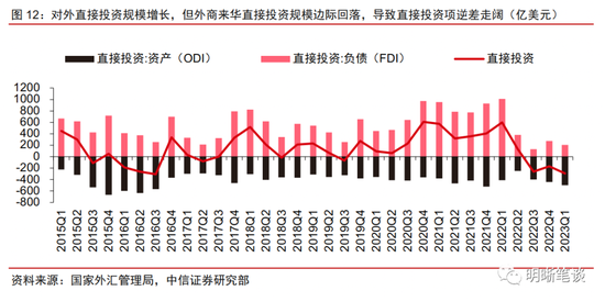 对外直接投资规模增长,但外商来华直接投资规模边际回落,导致直接投资项逆差走阔。2023年初,一方面,随着疫情因素的趋缓以及国内经济预期的改善,外商对于国内经济基本面的信心逐步修复,1月和2月的当月实际使用外商直接投资金额有所回暖。但从国际收支维度来看,今年一季度“直接投资:负债”(即外商来华投资)的规模较去年四季度相比略有下滑。另一方面,国内防疫政策的大幅优化或便利国内部分主体加快对外投资步伐,带动我国对外直接投资规模增长。往后看,随着高质量建设“一带一路”等政策推动,我国对外直接投资有望保持一定增长,而外商来华直接投资或仍面临地缘政治因素的扰动。因此,预计吸引外商投资的重要性将不断提升,推动我国加入CPTPP和DEPA等更多高标准经贸协议、有序推进海南自贸港建设,或将成为我国更高质量、更大规模地吸引外商来华投资的重要举措。