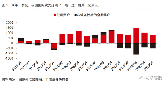 今年一季度,我国国际收支延续“一顺一逆”格局。在“出口维持一定韧性+进口持续疲弱”支撑货物贸易、以及跨境活动修复导致服务项逆差走阔的共同影响下,经常账户顺差虽出现收敛态势,但仍保持一定规模。直接投资项和证券投资项均存在一定的资本外流压力,但其他投资账户录得较大规模顺差,有效对冲部分渠道的资金流出压力。