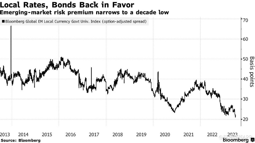 新兴市场本币债券风险溢价降至10年低点