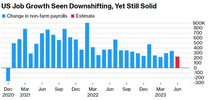 美国将公布6月非农就业数据。即将发布的美国劳动力市场数据预计将显示就业增长放缓但仍然健康,而失业率预计将降至3.6%的历史低位,平均时薪较同比增长放缓至4.2%,这将是两年来最小的年度增幅。本周将公布“小非农”ADP等数据,预计将显示职位空缺减少。分析师预计美国6月非农就业人口增加22.5万人。尽管总体上仍被认为是强劲的,但这将是自2020年底以来涨幅最小的一次。
