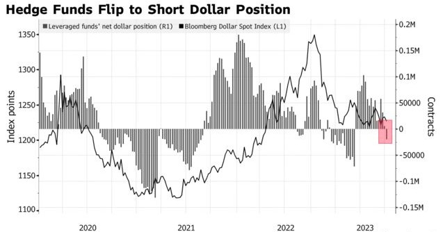 对冲基金自3月以来首次转向整体看空美元,押注美联储接近加息周期的尾声。根据美国商品期货交易委员会(CFTC)数据,在截至7月7日的一周内,杠杆投资者转为美元净空头头寸的数量为20091份,一周前为5196份合约。