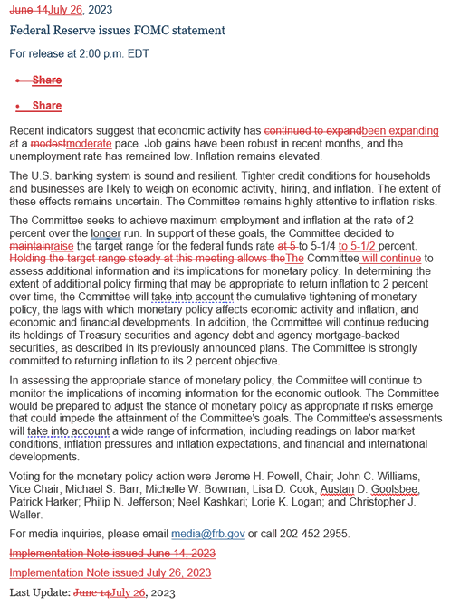 其他略有修改之处是,6月声明称“最近的指标显示,经济活动继续以温和的步伐扩张”,而本次则称:“最近的指标显示,经济活动一直以温和的步伐扩张。”