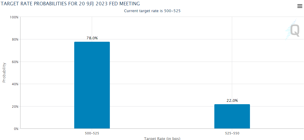 而在隔夜美联储决议公布后,利率市场的定价对9月加息的预期也并不算非常强烈。最新概率预期显示,美联储届时有78%的可能性按兵不动,而加息25个基点的概率只有22%。