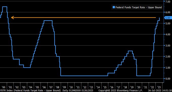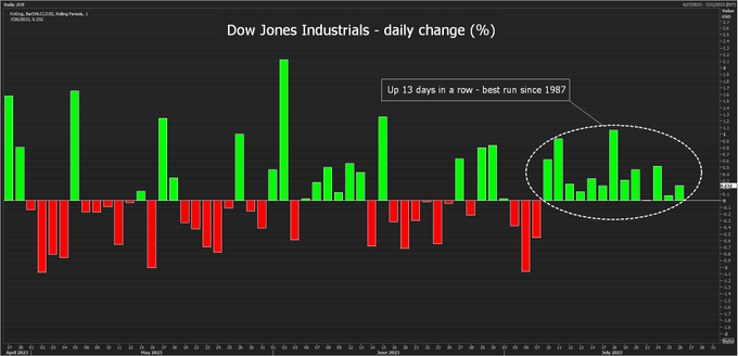 周三,道指自1987年1月以来首次连续13个交易日上涨,同时美联储如市场预期宣布加息25个基点,将联邦基金利率目标区间上调至5.25%到5.50%,来到了22年来的最高位。