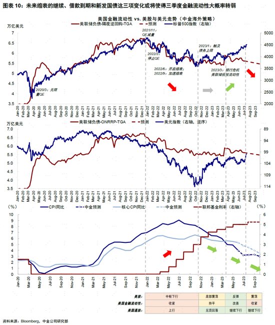 其次,“量”的影响看,三季度金融流动性大概率转弱。我们在《失去流动性“助力”的美股》中分析,金融流动性对于美股和美元中期走势有较好解释度,这一指标(美联储负债端-TGA账户-隔夜逆回购ONRRP,近似银行准备金)二季度因银行问题激增、叠加通胀持续回落,是美股大涨的原因之一,也是去年美股持续承受压力的原因。三季度,美联储缩表(每月950亿美元)、银行危机后美联储借款逐步到期、债务上限解决后财政部再发债,这一金融流动性也或将转弱,不过因为通胀还在继续下行,因此,我们预计综合的影响会使得美股弱于二季度但强于去年,四季度在能倒逼成功宽松预期前或有阶段压力,随后再反弹。对于美元,三季度流动性收紧仍可能给美元提供支撑,判断趋势性拐点为时尚早。