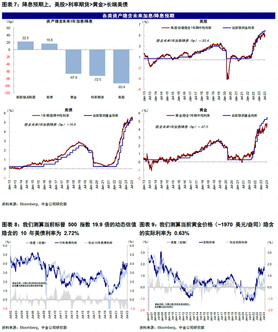 首先,“价”的预期上,加息接近尾声但降息还有时间,结合我们在(《市场与美联储的“分歧”有多大?》)中对不同资产计入预期的测算(从计入未来一年降息预期多少排序,依次为美股3.7次>利率期货2.9次>黄金2.7次>长端美债),可以初步得出结论是:1)利率期货认为不会再有加息同时明年3月开始降息;2)长端美债3.8%当前基本合理,要想开启进一步大幅下行空间可能要到四季度的增长压力和降息预期出现;3)黄金,更大涨幅靠实际利率驱动也在这一阶段;4)美股计入的预期相比其他资产偏多,略高于当前CME利率期货隐含的预期。换言之,如果加息路径不超预期的话,压力也不会很大。