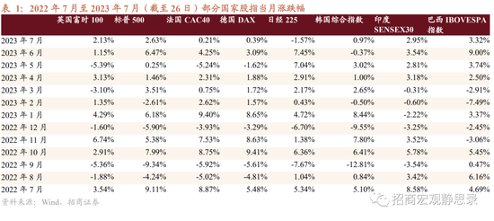 其次,上半年国内权益资产或可对标去年下半年海外权益,进而未来一年国内权益资产的确定性正在增强。如表1所示,去年下半年在防疫放松后经济结构尚不明确、加速加息推升无风险利率并导致经济预期偏弱等多重不确定性冲击下,美股等海外权益资产跌多涨少。今年上半年国内权益整体表现不及春节前的市场预期,但好于去年下半年海外权益市场。国内防疫优化较海外滞后半年,因此上半年经济波动较大,与去年下半年海外较为类似。好在此间海外风险偏好较好,美联储减速加息10年期美债收益率与美元指数中枢下移亦对国内金融条件形成边际提振,加上国内出口好于预期,进而上半年国内权益表现好于去年下半年的美股。三点因素共振之下,未来一年国内权益资产的确定性也在增强:1)7月政治局会议释放积极信号;2)若专项债落实提速、地产融资改善,下半年固定资产投资增速有望回升,国内经济大概率好于Q2;3)服务部门转弱将拖累美国经济,但地产与制造业等实物部门将继续向好,进而8-12月国内出口增速将持续回升。