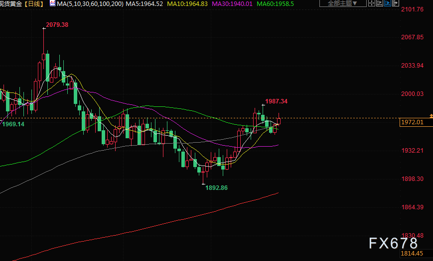 现在的焦点转向欧洲央行和日本央行将于本周稍晚做出的政策决定。纽约独立金属交易商Tai Wong表示:“名义上,多头仍是金市的主流,但他们需要推动金价回到每盎司1988美元的近期高位上方,以保持动能。”