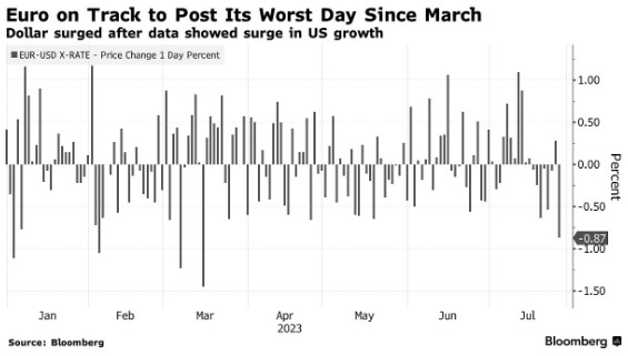 欧洲央行宣布这一消息后,欧元兑美元汇率下跌了近1%,有望创下3月份以来的最大跌幅。强劲的美国经济数据和拉加德对近期经济前景的警告加剧了这一损失,拉加德表示,主要由于国内需求疲软,经济前景已经恶化。