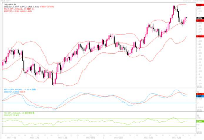 周四(7月27日)英镑兑美元大跌1.09%,低收盘于1.2795,盘中一度低至1.2783的两周低点。此前好于预期的美国经济数据继续打击投资者对美联储相对鸽派货币政策的预期。因为最近一连串强劲的数据显示,从目前情况看,美国将避免陷入经济衰退,这增加了美联储在经济数据继续全面强劲的情况下进一步加息的可能性。美国第二季度经济增长速度超过预期,原因是劳动力市场的韧性支撑了消费者支出,同时企业增加了设备投资,经济衰退有可能得以避免。美国劳工部的报告显示,截至7月22日当周,经季节性调整后初请失业金人数减少7,000人,为22.1万人,创2月以来最低。经济学家此前预测为23.5万人。由此看,美国连续十一次的加息,似乎并未太伤及经济的前进步伐,极有可能在控通胀和经济发展两方面取得软着陆的平衡效果。为此,美元颇得到提振。而近期对英国央行收紧政策程度的进一步怀疑则对英镑构成了不利的影响。日线图上,英镑/美元明显坠落于布林带通道中轨线之下,各类技术指标转向下行明显,显示英镑见顶回落态势明显。下方初步支撑在1.2670,进一步下跌的话,将是一个月前的升浪起步水平1.2600。能否稳住跌势,则要看下周英央行的加息能否给到英镑以抬捧。