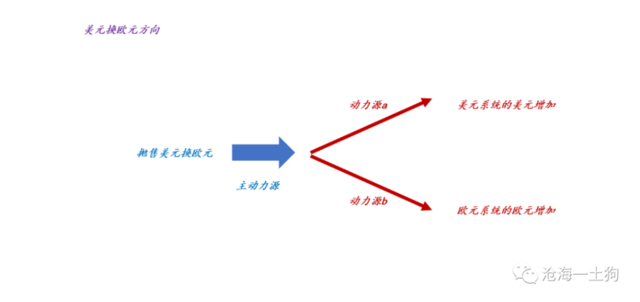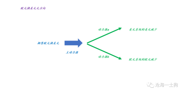 如果方向反过来,有趣的事情发生了——主动抛售欧元换美元的持续力量会导致两个分力,1、美元区的美元持续减少;2、欧元区的欧元持续减少。具体如下图所示: