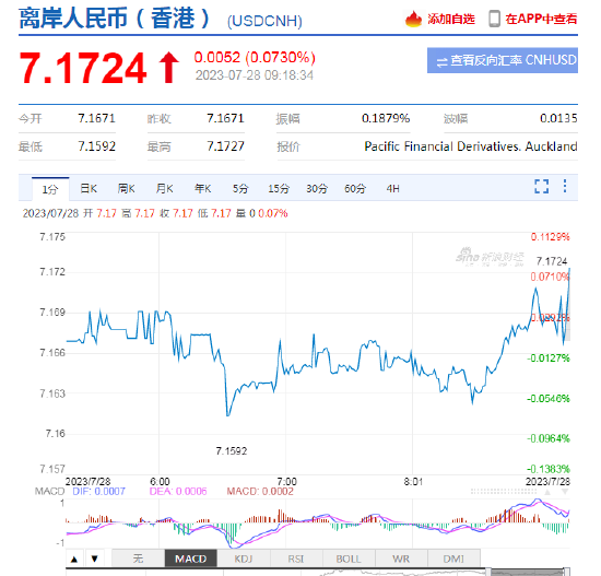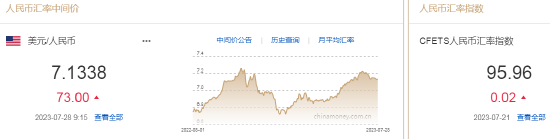 7月28日,人民币中间价报7.1338,下调73点,上一交易日中间价报7.1265,在岸人民币上一交易日收报7.1404。