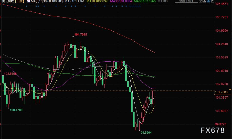 衡量美元兑六种主要货币汇率的美元指数上涨0.692%,至101.790;欧元下跌1.06%,至1.0965美元。