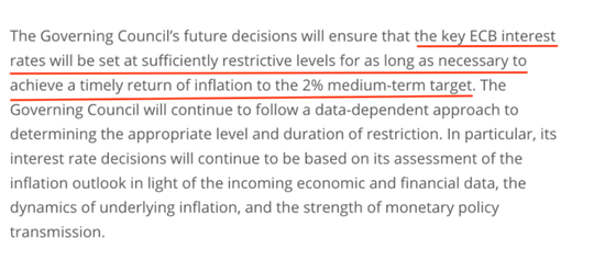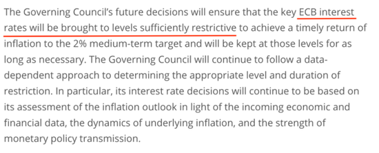 潜在通胀仍然很高,过去的加息继续在金融环境中传导:融资条件再次收紧,并日益抑制需求,这是通胀回到目标水平的重要因素。