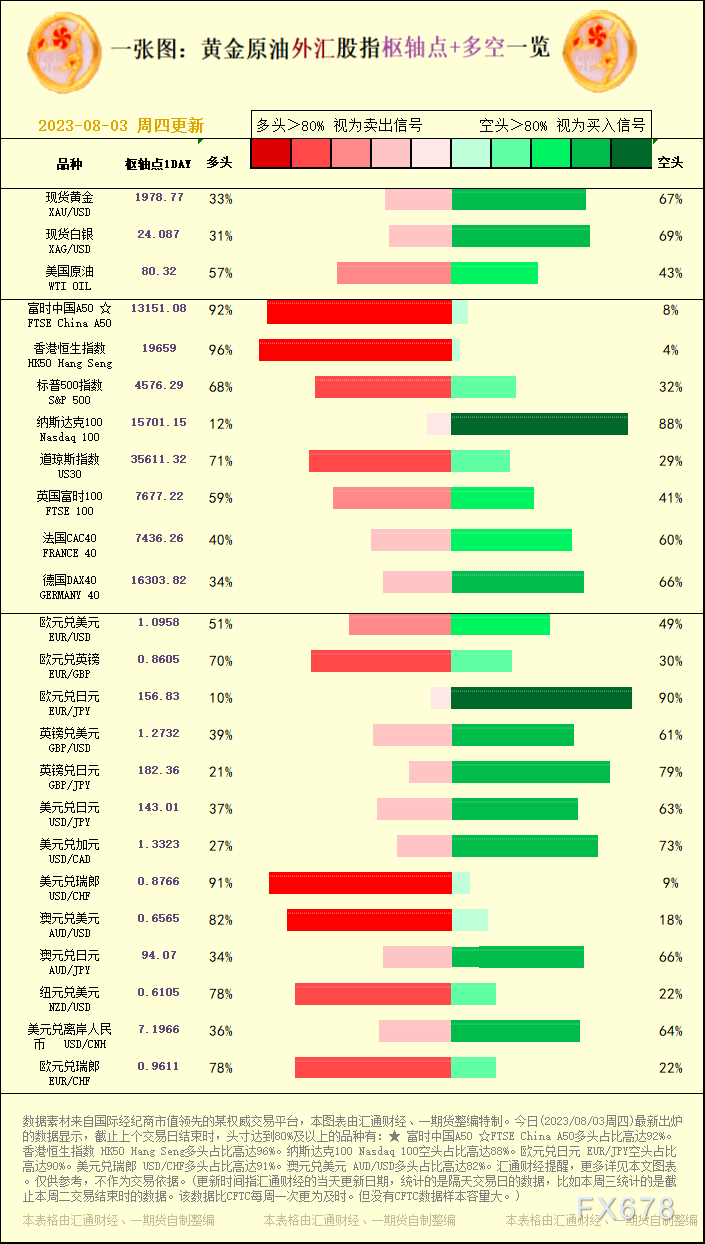 汇通财经APP讯——一张图:黄金原油外汇股指“枢纽点+多空占比”一览。今日(2023/08/03周四)最新出炉的数据显示,截止上个交易日结束时,头寸达到80%及以上的品种有:★ 富时中国A50 ☆FTSE China A50多头占比高达92%。香港恒生指数 HK50 Hang Seng多头占比高达96%。纳斯达克100 Nasdaq 100空头占比高达88%。欧元兑日元 EUR/JPY空头占比高达90%。美元兑瑞郎 USD/CHF多头占比高达91%。澳元兑美元 AUD/USD多头占比高达82%。汇通财经提醒,更多详见本文图表。仅供参考,不作为交易依据。