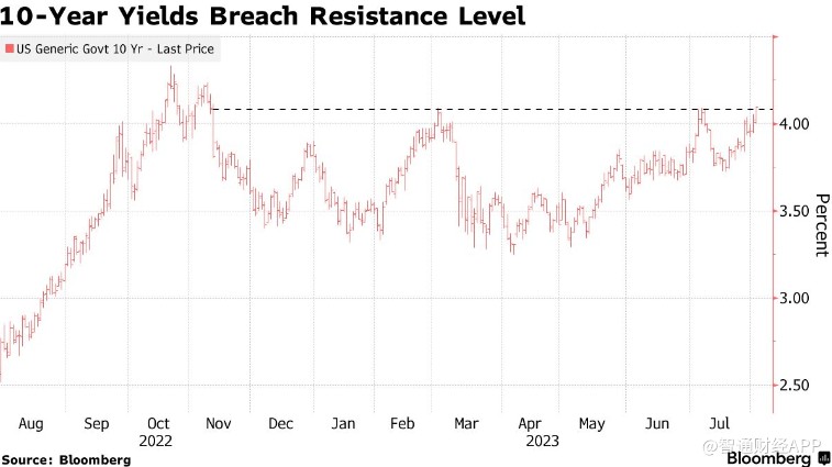 债券投资者正将美国国债收益率推至2023年的新高,因为他们受到大规模政府债券发行计划和就业市场持续强劲迹象的惊吓。周三,各期限美国国债价格下跌,10年期国债收益率上涨10个基点,至4.12%,为2022年11月以来的最高水平,30年期国债收益率达到4.2%,为近9个月来的最高水平。
