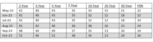 其中,长期债务将在前期发行中大幅增长,10年期、20年期和30年期债务的最大规模增长将出现在本月。较短期债券,如2年期、3年期和5年期的发行量将稳步上升。