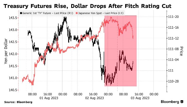 惠誉的决定在周三引发了类似的反应。亚洲股市下跌,两年期美国国债收益率下跌多达3个基点。基准10年期美国国债收益率在下跌2个基点后,小幅上涨1个基点,至4.03%。