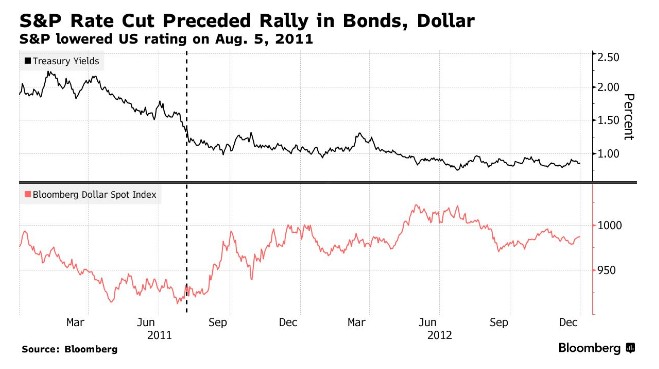 曾在2011年,标普下调美国信用评级引发了全球股市等风险资产的抛售,但随着投资者寻找避风港,美国国债得到了提振。同年8月8日,即标普下调评级后的第一个交易日,10年期美国国债收益率下跌了24个基点。