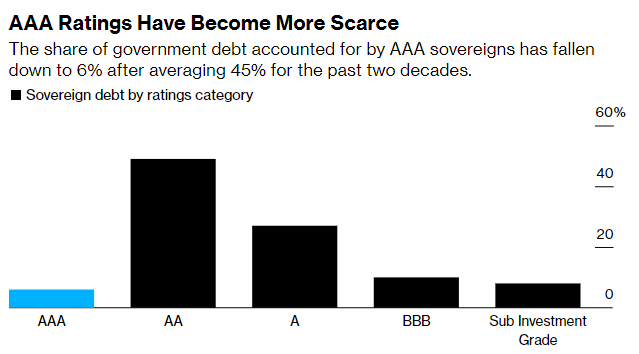 这是发达经济体逾10年来信用坍塌趋势的最新例证。在惠誉评级(Fitch Ratings)将美国评级下调至AA+后,该公司表示,目前仍保留在其AAA评级名单上的国家数量已减少到了9个,仅占全球政府债务总额的6%,而此前这一比例还高达41%。